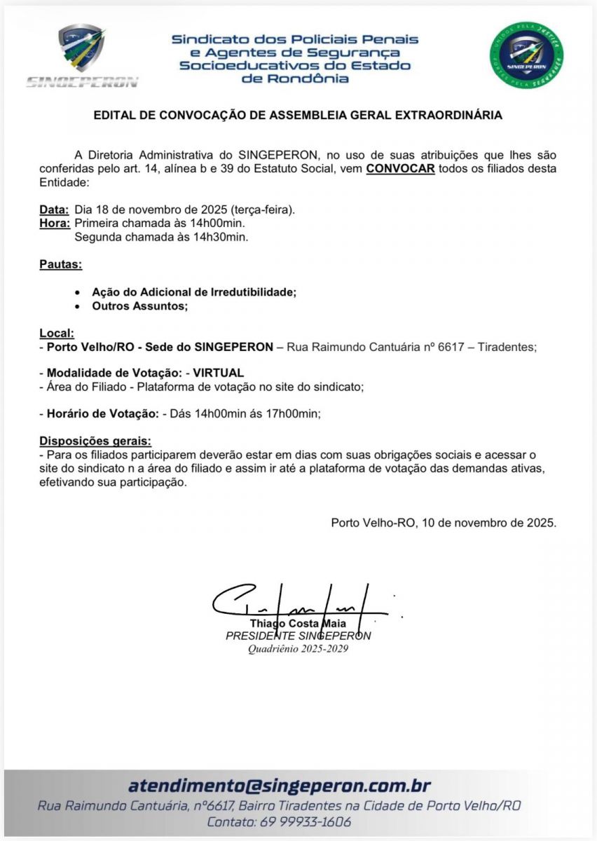 O Sindicato dos Policiais Penais e Agentes de Segurança Socioeducativos do Estado de Rondônia (SINGEPERON) divulgou nesta segunda-feira (10) o edital de convocação para Assembleia Geral Extraordinária, que será realizada no dia 18 de novembro de 2025 (terça-feira).