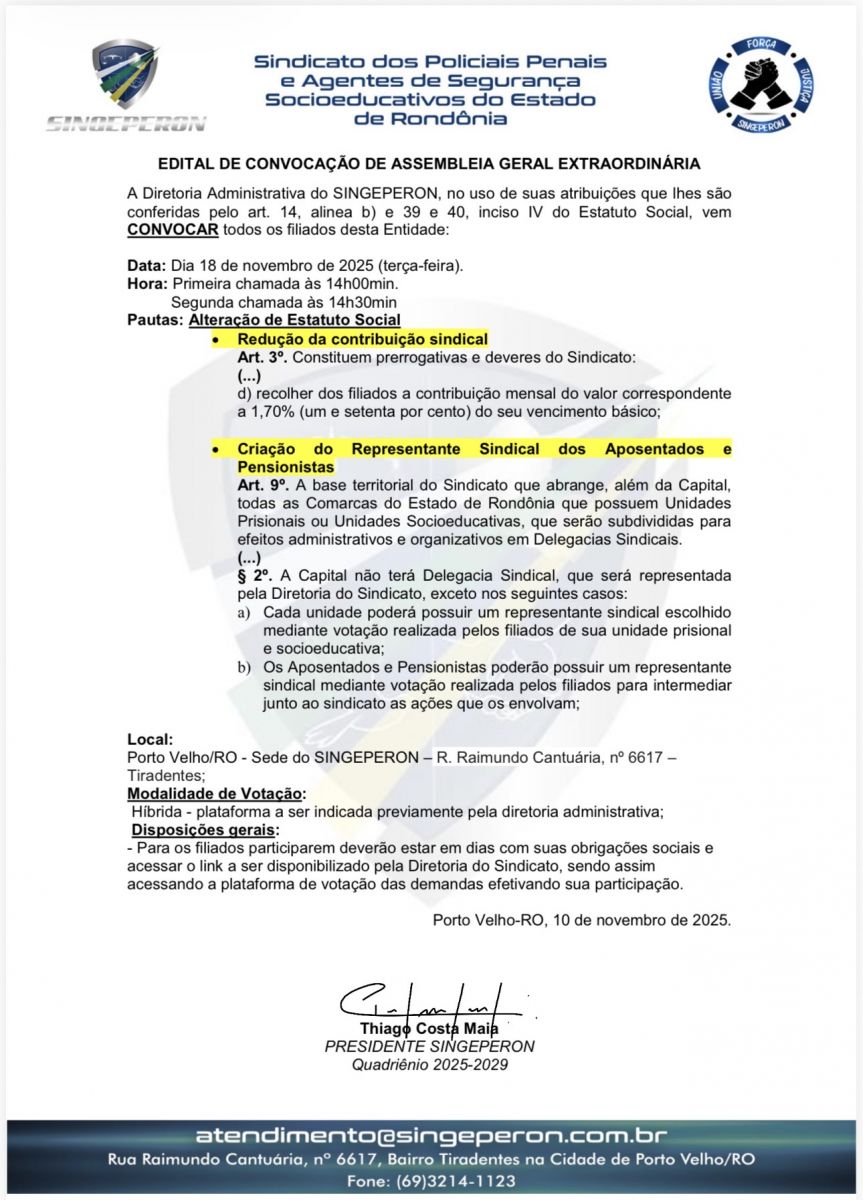O Sindicato dos Policiais Penais e Agentes de Segurança Socioeducativos do Estado de Rondônia (SINGEPERON) publicou nesta terça-feira (10) o edital de convocação para Assembleia Geral Extraordinária, a ser realizada no próximo dia 18 de novembro de 2025 (terça-feira).